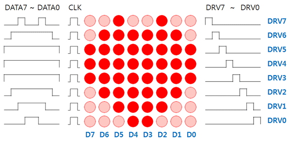 For the line driving of the LED matrix, a ULN2803 or TD62083 is used in this project. It is 8 channel sink driver and can drive up to 500mA per channel. In this application, the only one channel is turned on at a time synchronized with the output latch clock to the 74HC574. From the channel 0(DRV0) to 7(DRV7), it is sequentially switched on, then come back to the channel 0(DRV0) again and repeat this procedure recursively. The following picture help you to understand how it works.